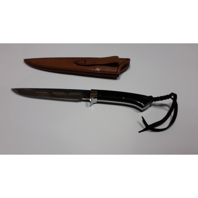 Manche monté sur plate semelle avec plaquettes micarta noir maintenues par 6 rivets maillechort. lanière cuir.