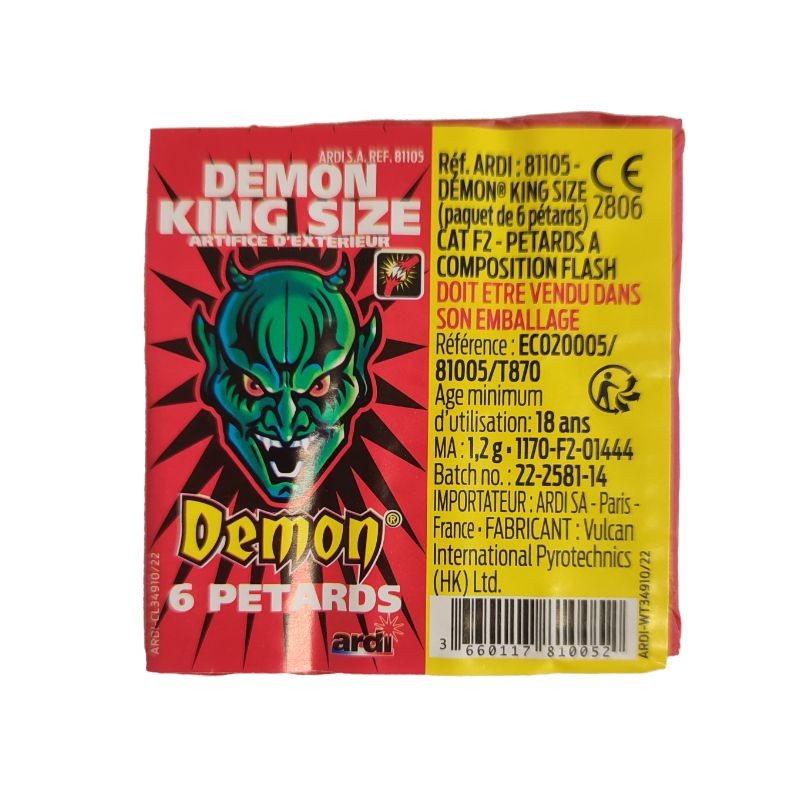Le Démon King Size d'ARDI, avec son pack de 6 pétards puissants, est la solution idéale pour ceux qui recherchent un artifice pas cher mais époustouflant. Chaque pétard, doté de 1.8 gramme de matière active, promet des détonations qui marqueront vos événements d'une empreinte indélébile.