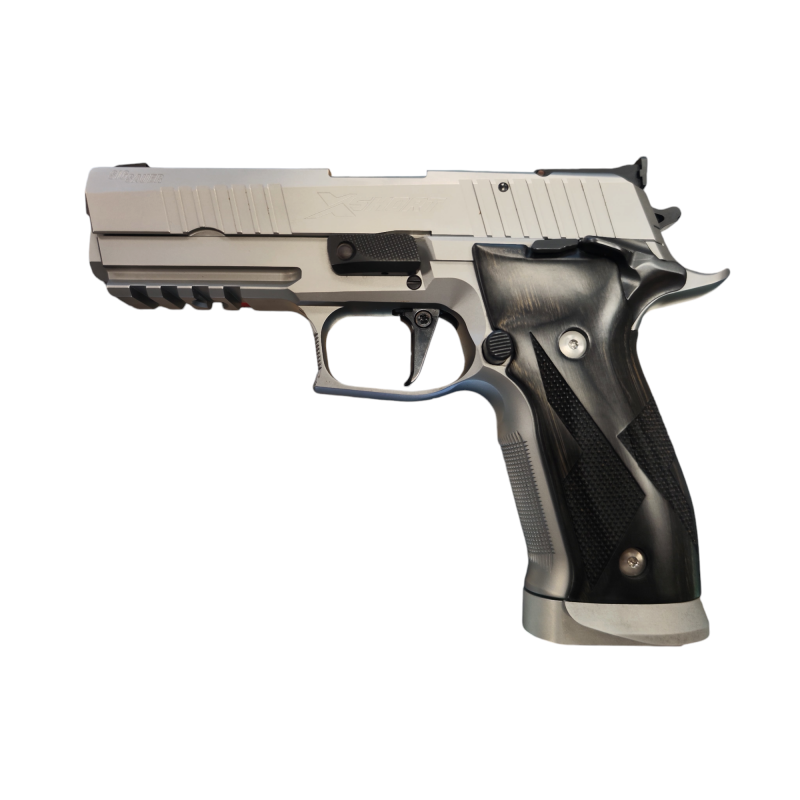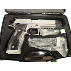 Pistolet semi-automatique Sig Sauer P226 X-Five Short Classic calibre 9x19 livré dans sa mallette ABS d'origine avec un chargeur supplémentaire de 17 coups, un tube de graisse Sig Sauer, une clé de réglage des organes de visée, 3 clefs Allen, la cible de réglage d'usine et le manuel d'utilisation.